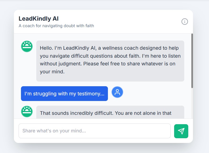 This Ai Chatbot, which I call Leading Kindly, is designed to help with that. It was built using Gemini on the idea that if we can develop our emotional resilience while simultaneously reframing our faith from being based upon perfect knowledge to one of faith, we can turn a faith crisis into a profound spiritual maturation.